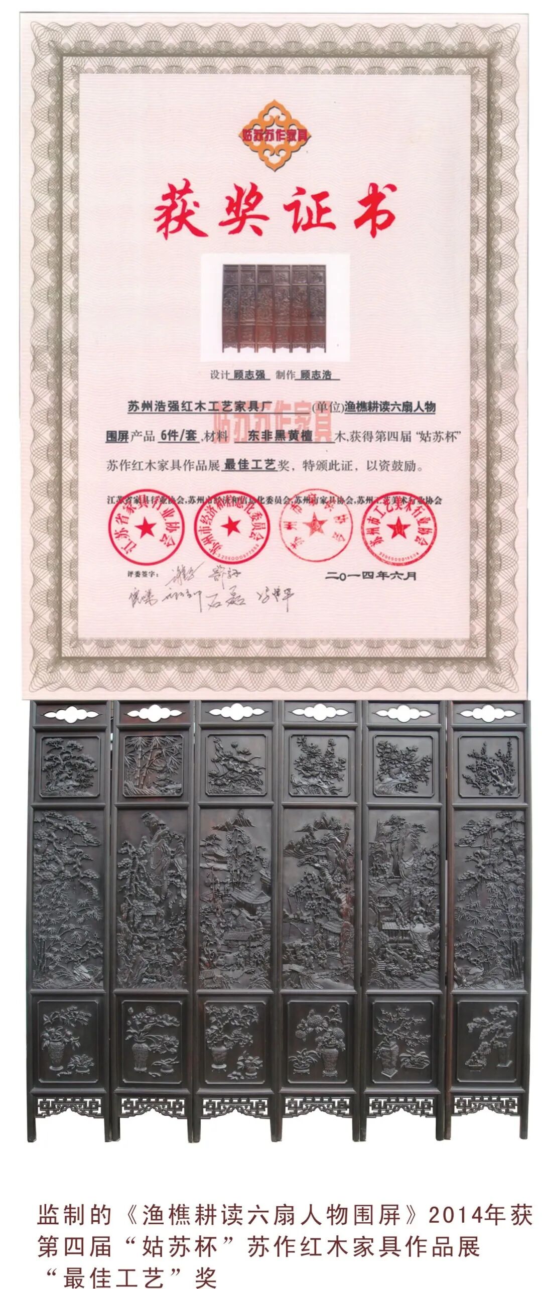 2014年6月 “东非黑黄檀渔樵耕读六扇人物围屏”获第四届“姑苏杯” 苏作红木家具作品展 最佳工艺奖