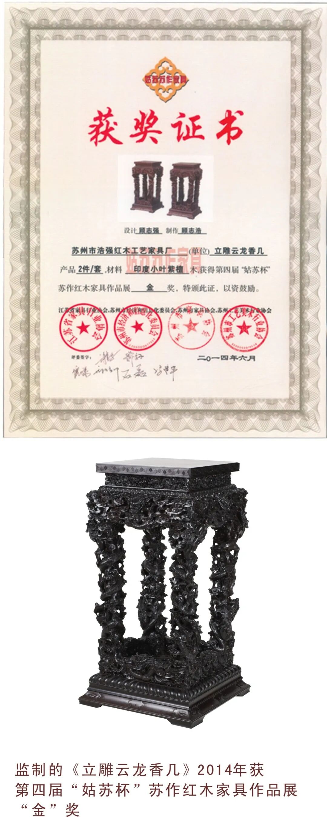2014年6月 “印度小叶紫檀立雕云龙香几”获第四届“姑苏杯” 苏作红木家具作品展 金奖