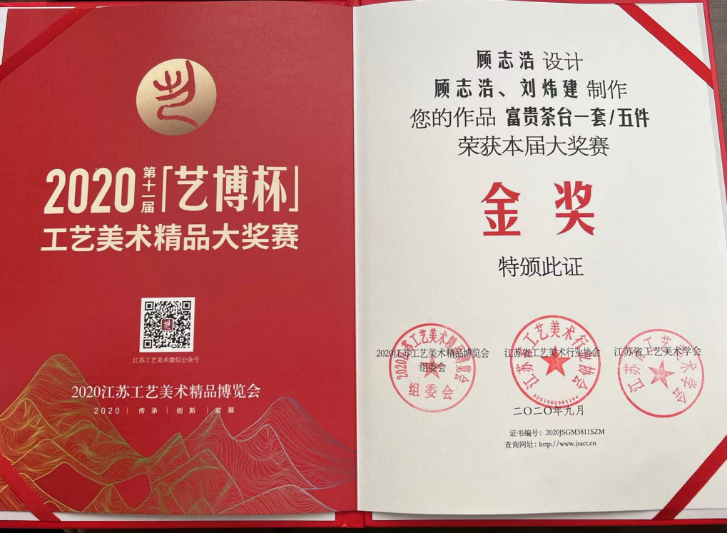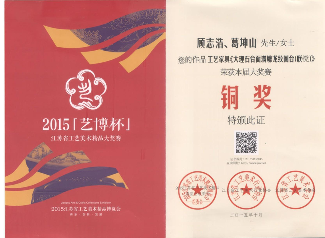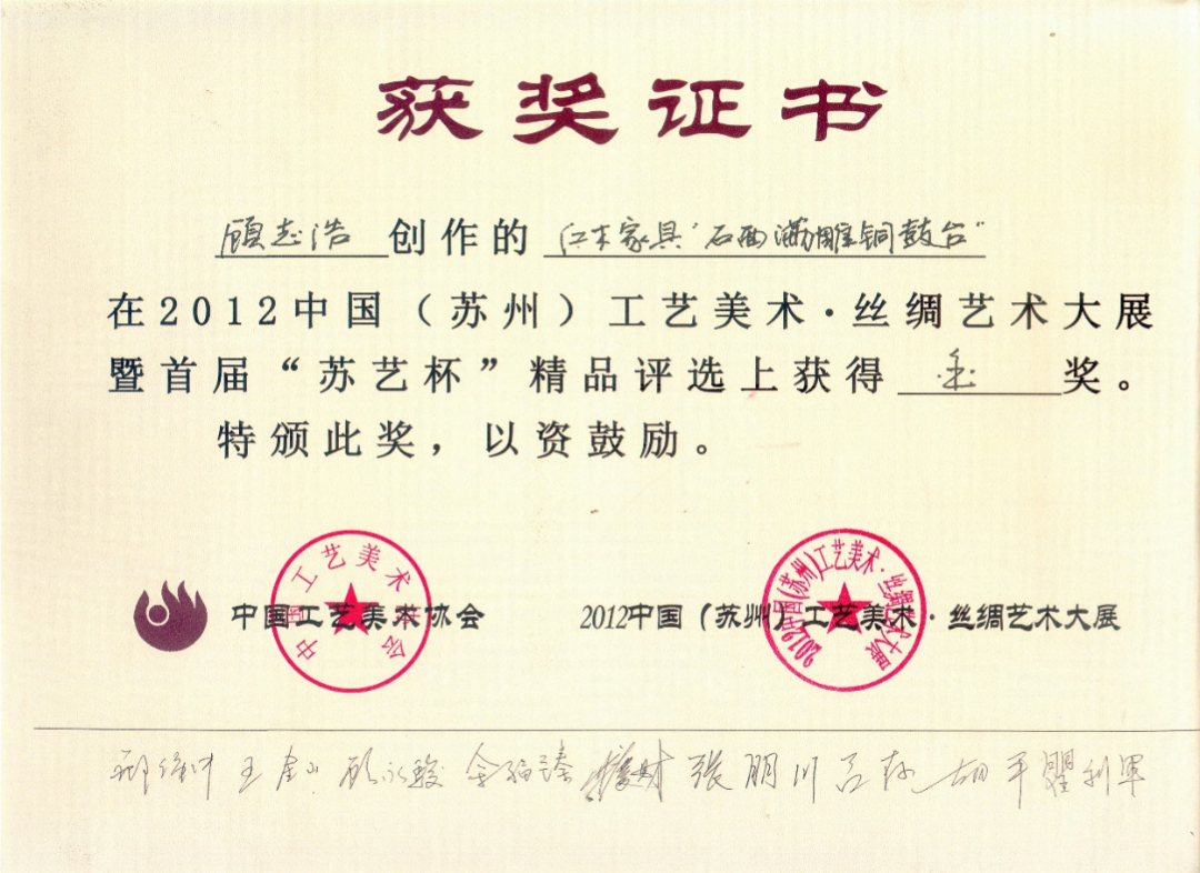 2012年“紫光檀云石面满雕铜鼓台”获中国(苏州)美术 丝绸大展暨首届“苏艺杯”之“金奖”