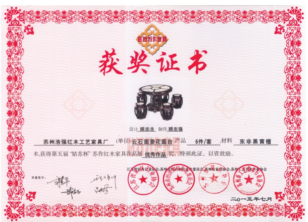 2015年7月“东非黑黄檀云石面夔花圆台”获第五届“姑苏杯”苏作红木家具作品展 优秀作品奖