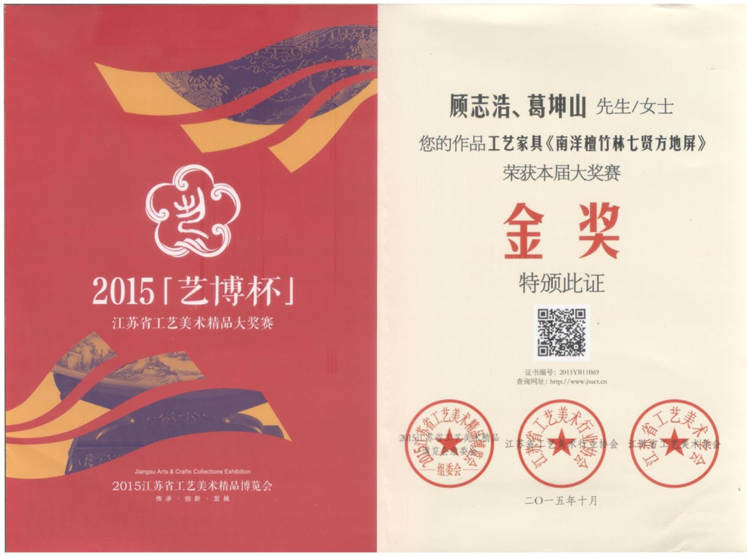 2015年10月“南洋檀竹林七贤方地屏”获艺博杯金奖