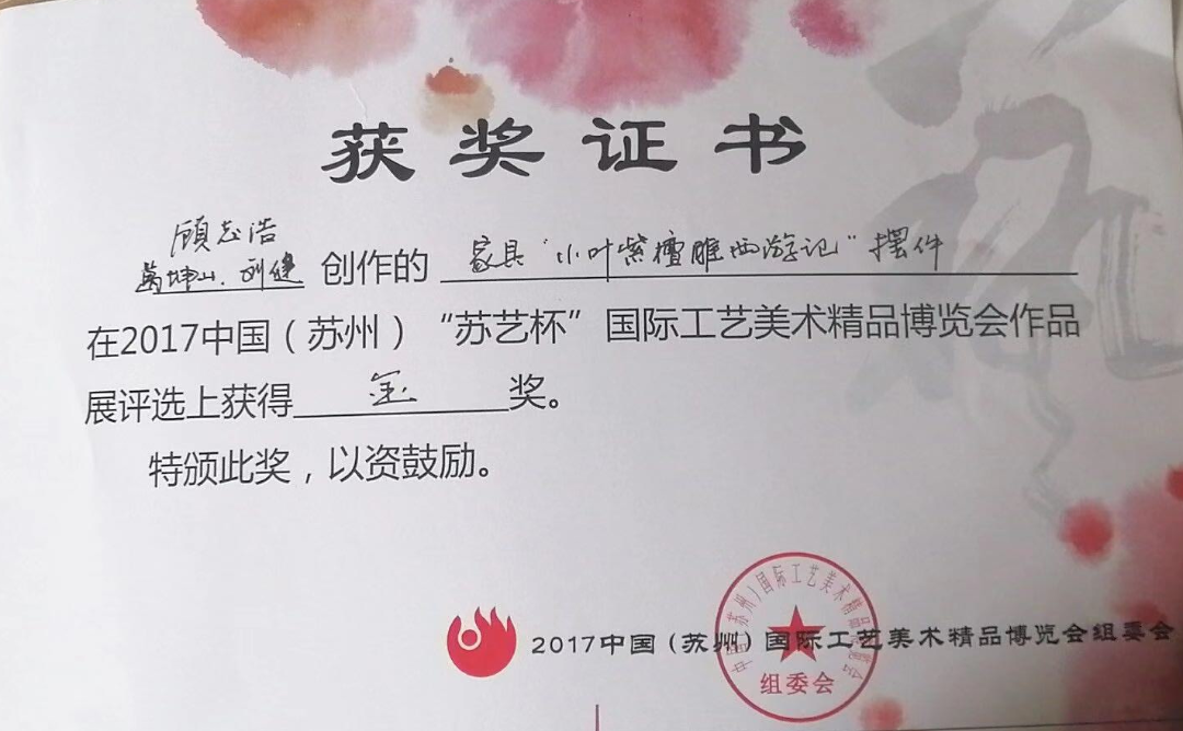 2017年“小叶紫檀西游记摆件” 获“中国(苏州)国际工艺美术精品博览会作品展”金奖