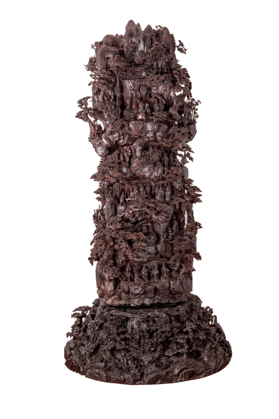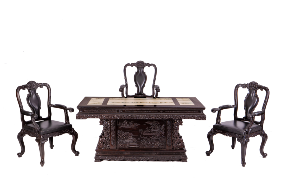 2015年10月“南洋檀大理石台面满雕龙纹圆台连凳”获艺博杯铜奖