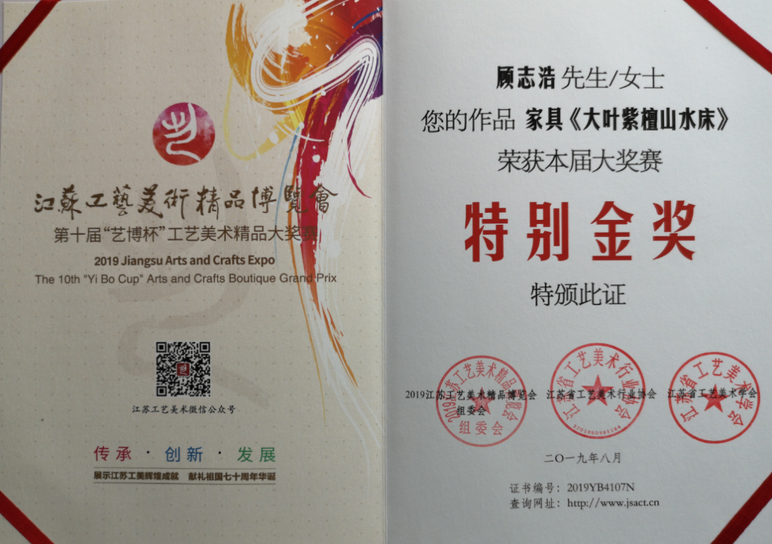 2011年“紫光檀云龙沙发”获第四届“百慧杯”中国艺术家具“匠心神工”工艺金奖