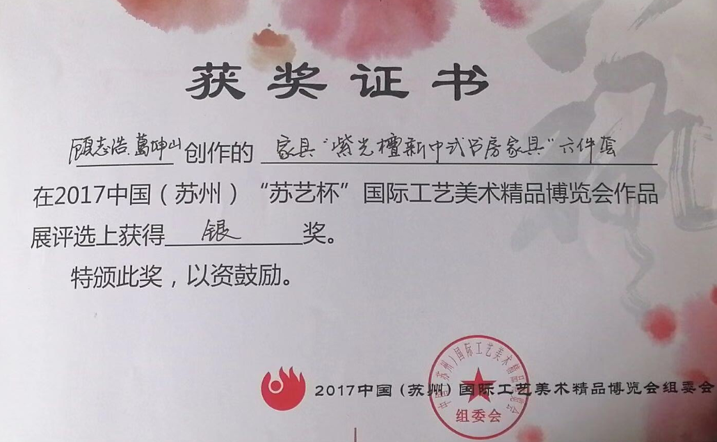 2017年“紫光檀新中式书房家具六件套” 获“中国(苏州)国际工艺美术精品博览会作品展”银奖