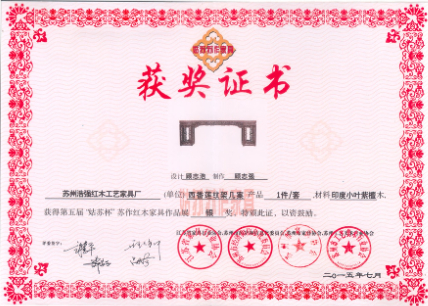 2015年7月“印度小叶檀西番莲纹架几案”获第五届“姑苏杯”苏作红木家具作品展 银奖