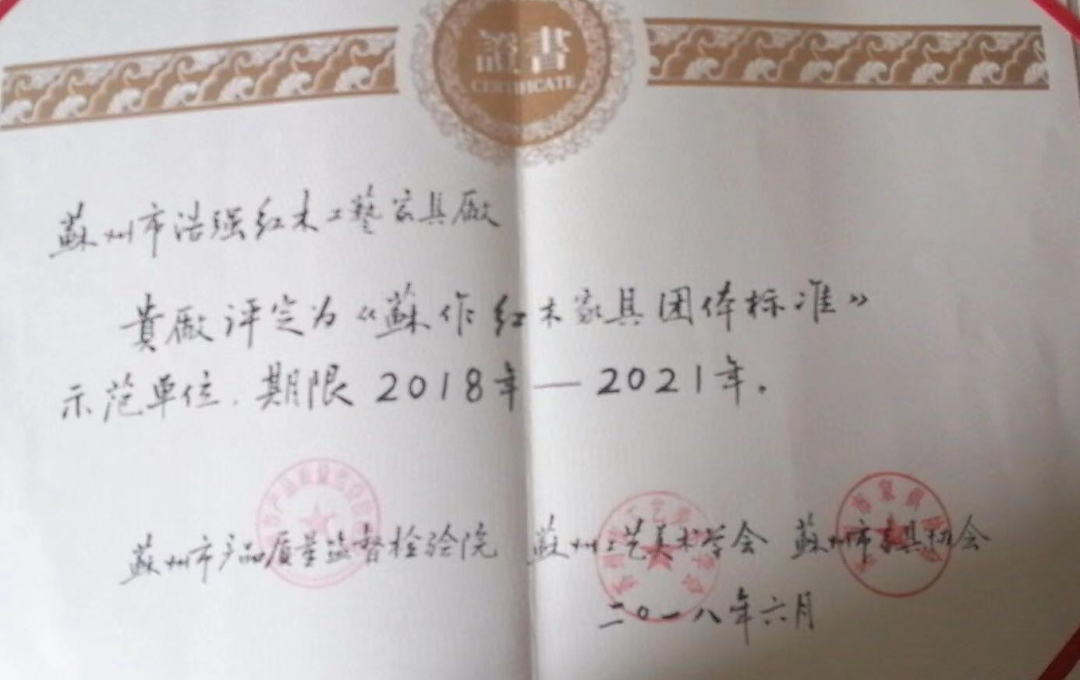 2018年6月领导的企业被评为“苏州红木家具团体标准示范单位”
