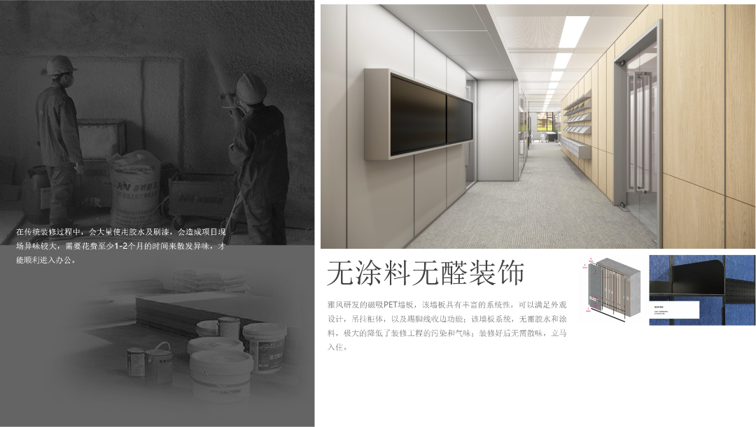 雅风坚持使用最环保的材料和可持续发展的理念;用先进技术,创造可重复利用的办公空间,积极探索零碳办公环境的未来。