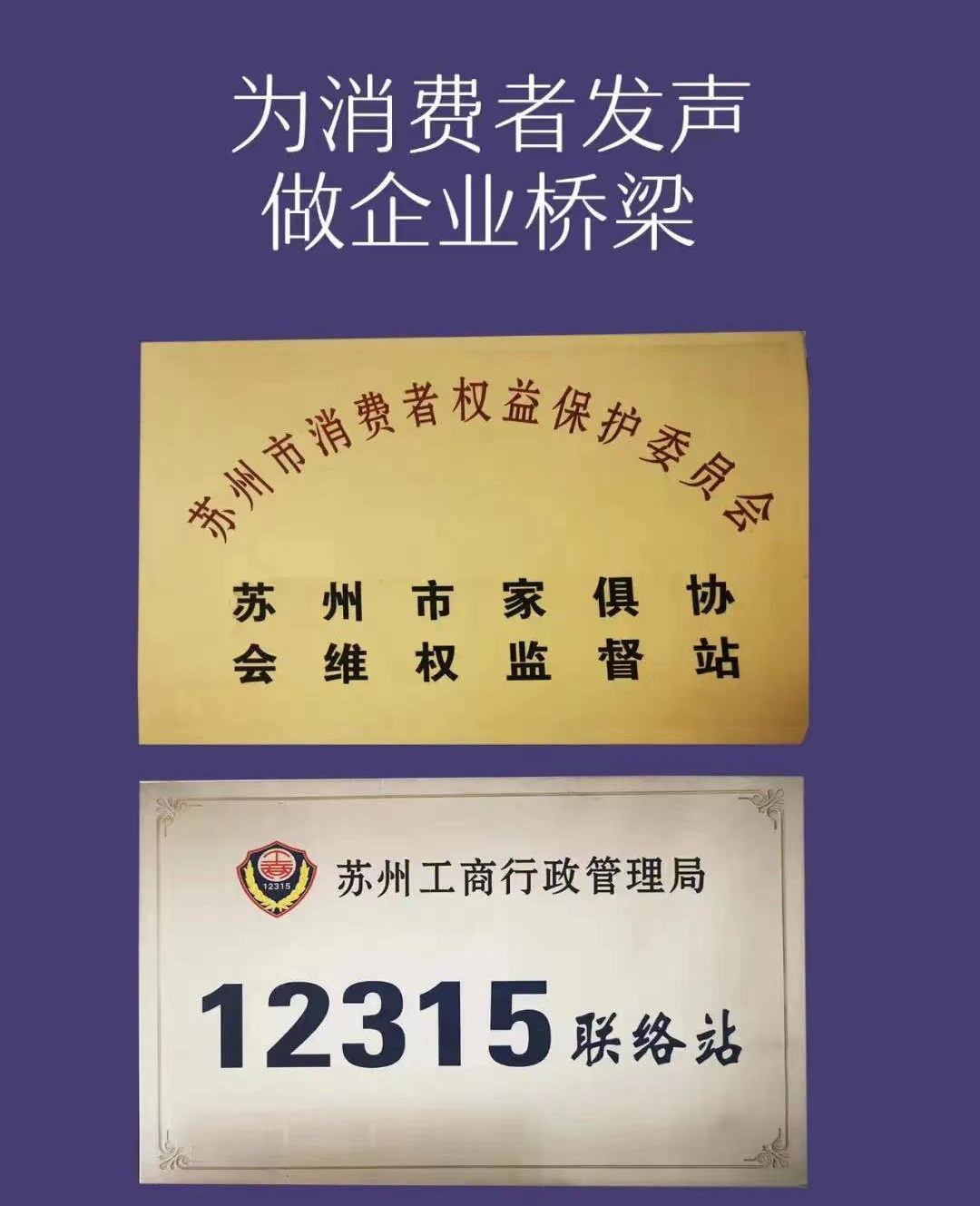 苏州市家居协会受苏州市消费者协会委托,目前建有苏州市消保委苏州市家具协会维权监督站和12315联络站,免费接受消费者有关家具消费的咨询投诉,以此督促会员企业诚信经营,完善服务机制,重视消费者合法权益;并及时、认真了解消费者投诉,做好受理有记录、处理有结果、问题能解决。