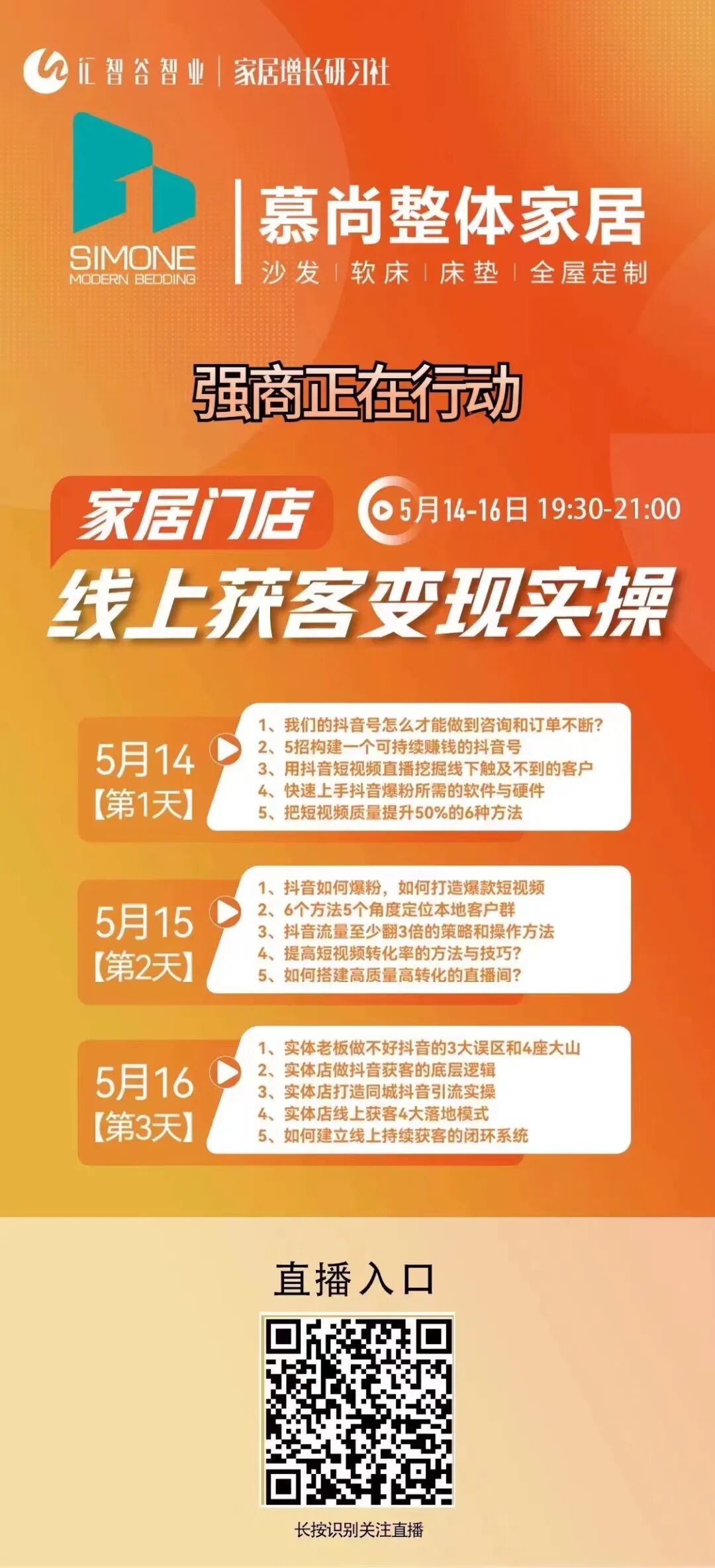 为了更好地赋能经销商,慕尚整体家居家居推出强商全域营销行动。5月14-16日,每晚19:30-21:00,慕尚家居联合汇智谷联合举办《家居门店线上获客变现实操》分享!边学边做,现学现用,既学即用!原价1980元/人,慕尚家居合作伙伴免费,相信再慕尚家居的鼎力支持下,经销商能够收获满满。