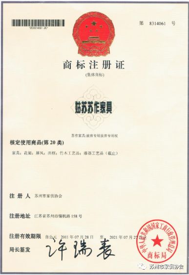 2011年苏州家俱协会注册的“姑苏苏作”家具团体商标,已为制定苏作红木家具标准的制定提供有力的支持。