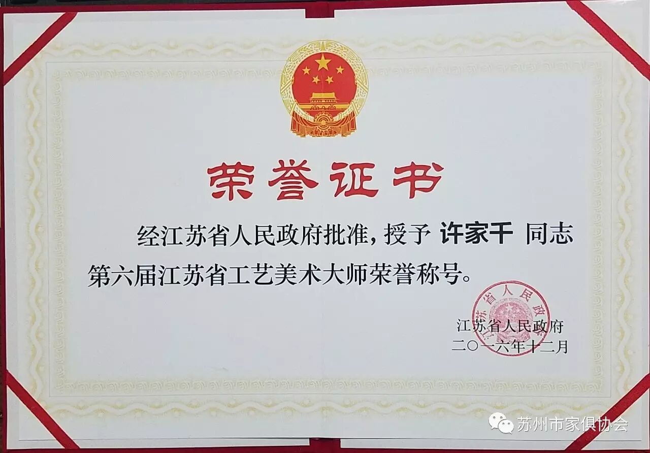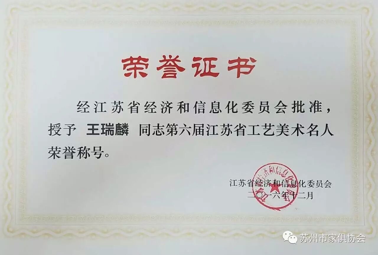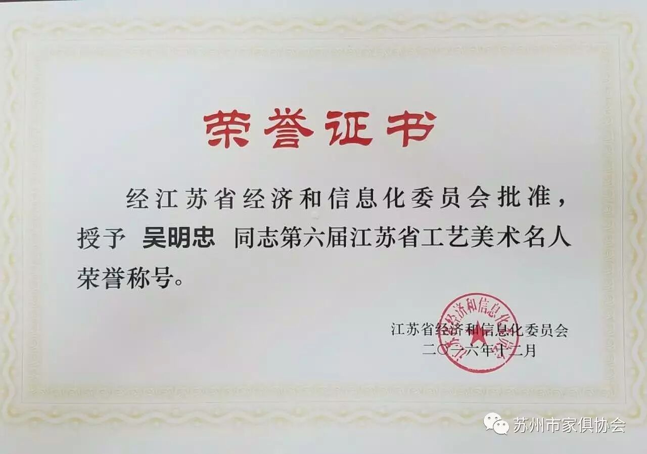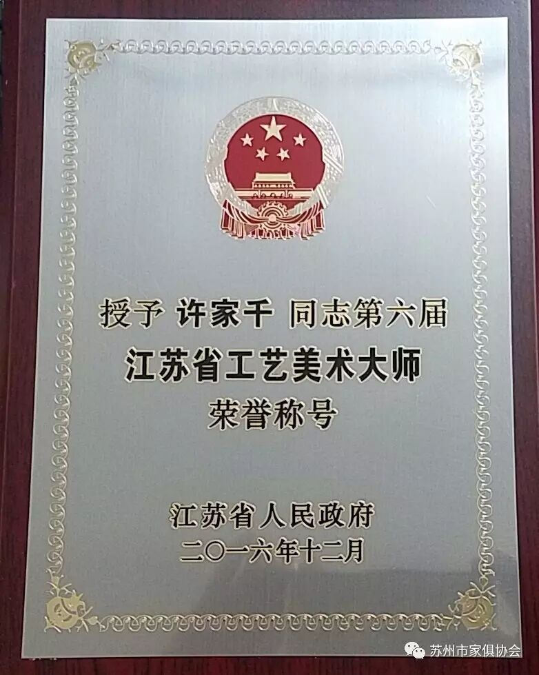 这次命名的第六届江苏省工艺美术大师和工艺美术名人总计有109位,苏州有25人获得殊荣,其中苏州家具行业(工艺家具)有许家千、宋卫东二位同志荣获江苏省工艺美术大师荣誉称号,有顾志浩、史忠民、吴明忠、王瑞麟、刘宝洪五位同志荣获江苏省工艺美术名人荣誉称号。