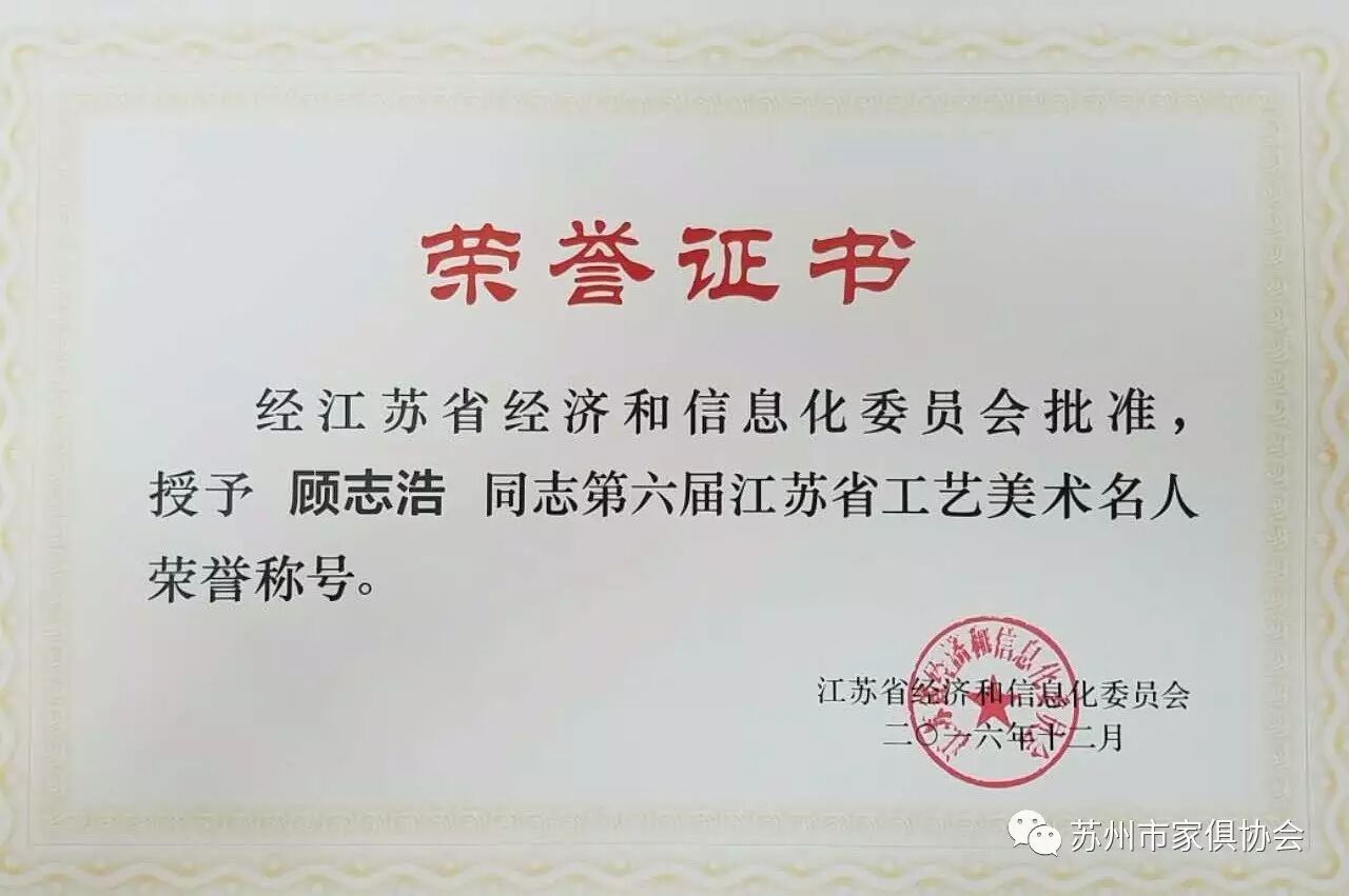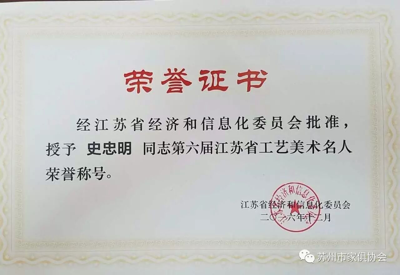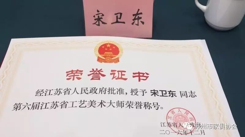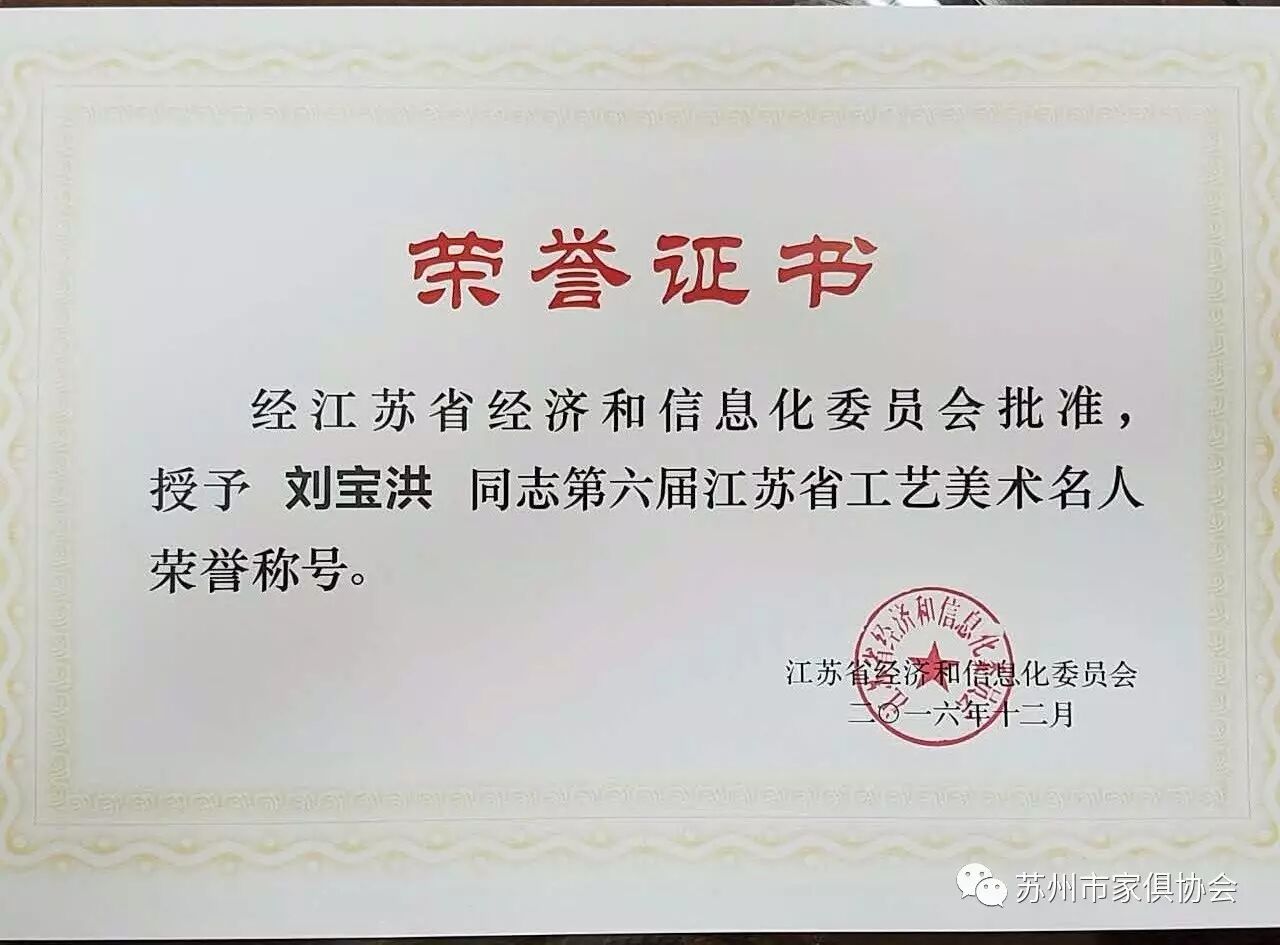 这次命名的第六届江苏省工艺美术大师和工艺美术名人总计有109位,苏州有25人获得殊荣,其中苏州家具行业(工艺家具)有许家千、宋卫东二位同志荣获江苏省工艺美术大师荣誉称号,有顾志浩、史忠民、吴明忠、王瑞麟、刘宝洪五位同志荣获江苏省工艺美术名人荣誉称号。