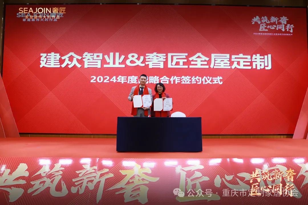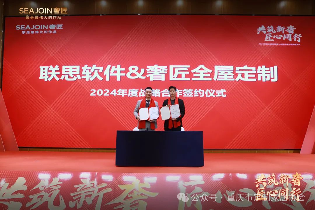 随着侯老师演讲结束,奢匠家居总裁刘总上台分别与建众智业侯老师、联思软件熊总、泾涧品牌周总签定2024年度战略合作计划,各方战略合作的达成,预示着奢匠将以更强的姿态开启新的品牌发展征程。