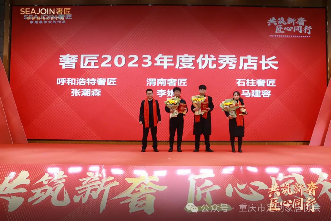 呼和浩特张潮森、渭南李娟、石柱马建容获得奢匠2023年度优秀店长称号。奢匠家居渠道总监刘成龙先生为获奖者颁发荣誉证书及奖杯!