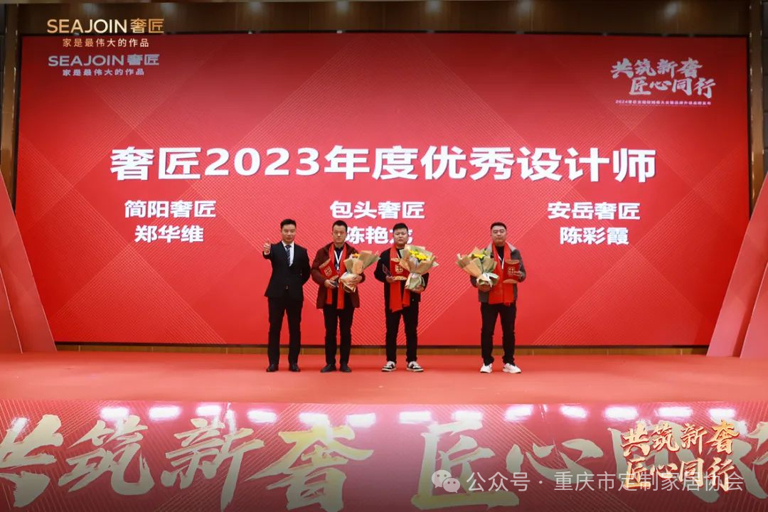 简阳郑华维、包头陈艳龙、安岳陈彩霞获得奢匠2023年度优秀设计师称号。奢匠家居生产总监郑强先生为获奖者颁发荣誉证书及奖杯!