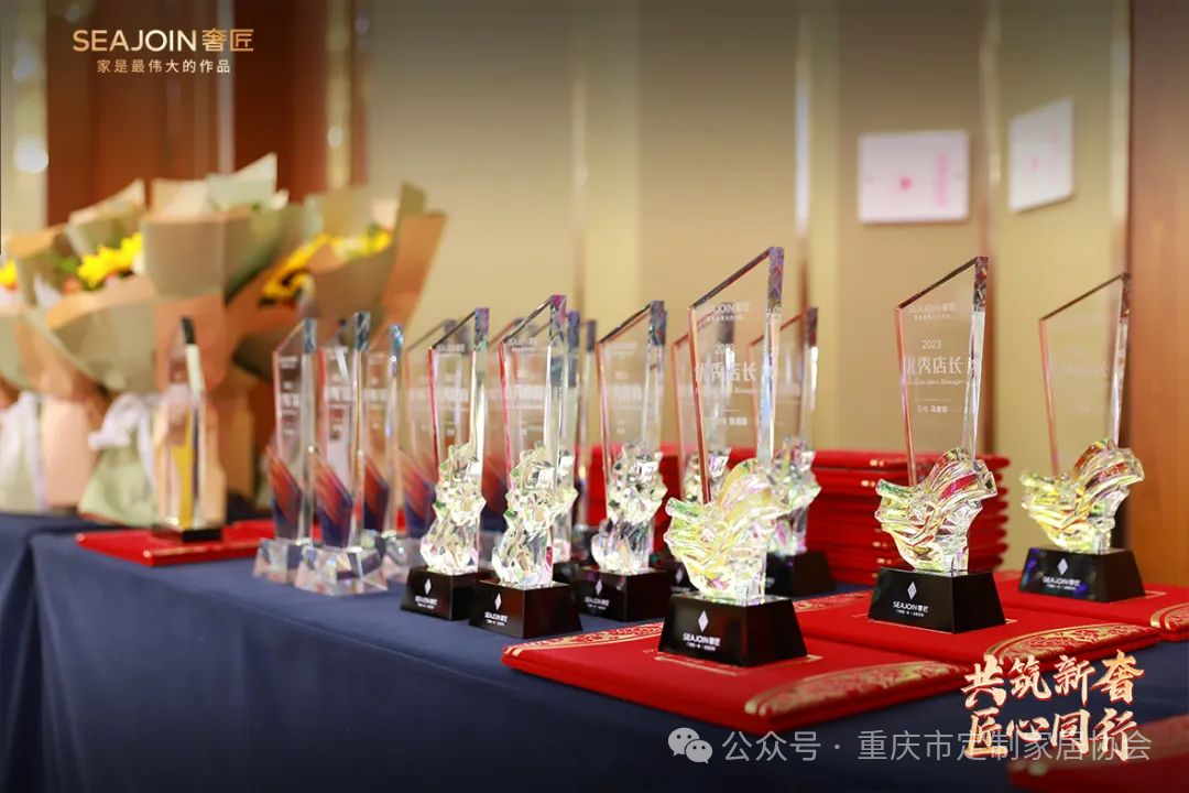 晋城、大连、固始、鄂尔多斯、西永、遂宁、都江堰、德江获得奢匠2023年度优秀门店。奢匠家居总裁刘程先生为获奖者颁发荣誉证书及奖杯!