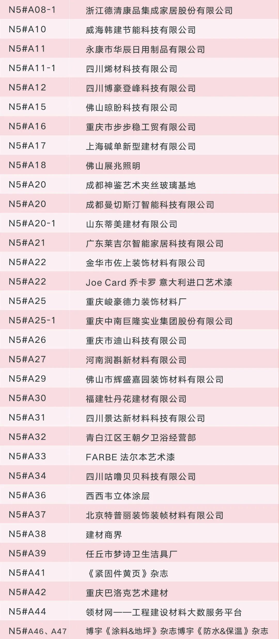 本届展览面积将30000平米,300+展商带来1000+款新品展示,展品涵盖大家居建装行业全产业链产品,包括:系统门窗、室内外门业、智能遮阳及护栏、幕墙及胶、玻璃、智能家居、整体衣柜、整体橱柜/厨房、楼梯、推拉门、壁柜移门、配套五金、木工机械、涂装定制、顶墙集成定制、吊顶系统、软装定制、地面材料、墙纸墙布及窗饰产品系列、整体卫浴、浴室柜、智能马桶、淋浴房及五金、厨电、陶瓷岩板、暖通舒适家居、墙体保温系统及材料、建筑屋面防水系统、建筑涂料及工业地坪、装配式建筑技术体系、装配式示范工程等。全面展示大家居建装行业全产业链的技术创新与产品变革,为中国最具生机与潜力的重庆地区建材市场提供更加全面的商业平台。