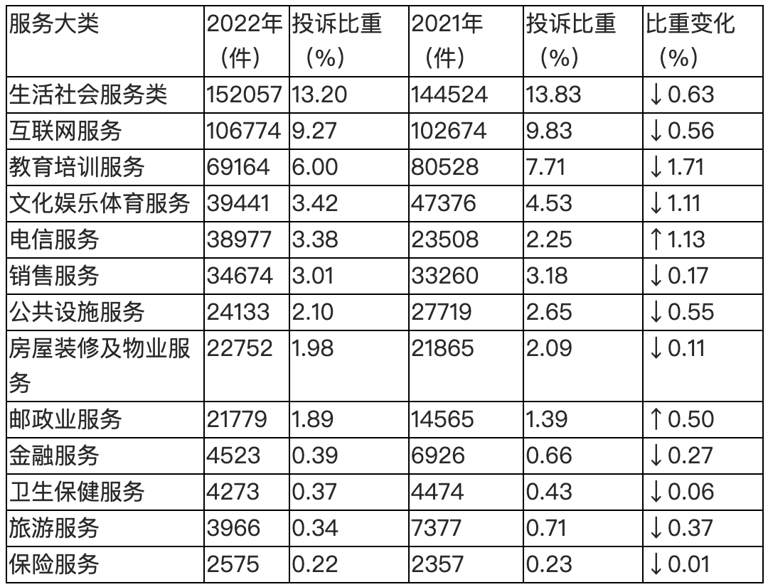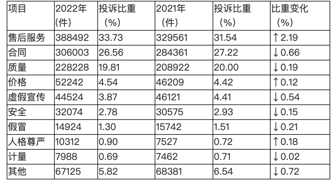 与2021年相比,售后服务问题投诉比重上升较高,合同与虚假宣传问题投诉比重有所下降,其余类投诉变化幅度较小。