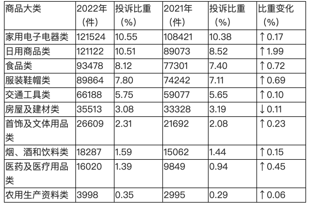 具体拆分类别来看,家用电子电器类投诉比重位居2022商品大类投诉表榜首,较之去年提升了0.17%,房屋建材类投诉比重占比3.08%,较去年下降0.11%,房屋装修及物业服务投诉比重下降0.11%。