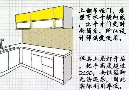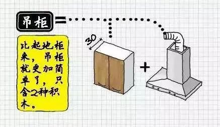 一般的橱柜都是图中这种形式的,吊柜、天面、地柜,吊柜建议大家都做上,除非你家厨房够大,不然以后一定会觉得不够装的。