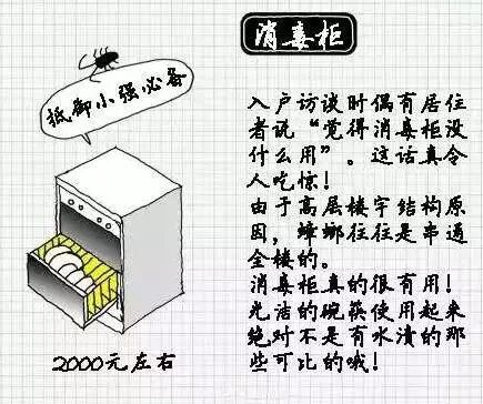 新型电器,比如消毒柜、洗碗机。很多人觉得消毒柜没必要,等你家蟑螂遍布的时候你就懂了。