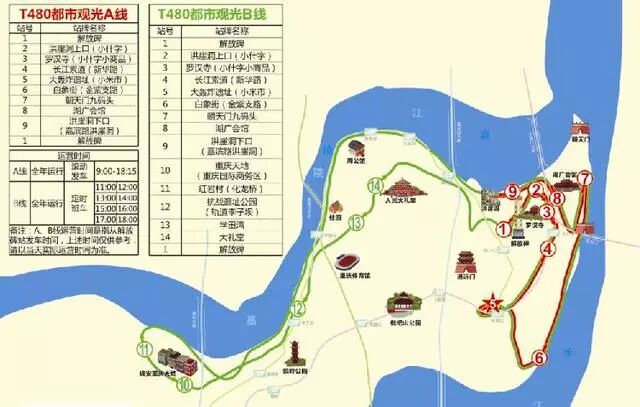 解放碑→洪崖洞上口(小什字)→罗汉寺(小什字小商品)→长江索道(新华路)→大轰炸遗址(小米市)→白象街(金紫支路)→朝天门九码头→湖广会馆→洪崖洞下口(嘉滨路洪崖洞)