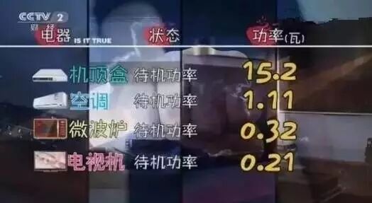 待机状态下,网络机顶盒功率为15.2瓦,机顶盒待机状态耗电量约为普通大电器的10倍!不拔插头一年最少“吃”50度电!