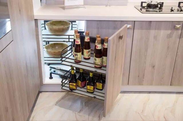 部分厨房的形状并不完全规则,从而形成橱柜死角,那么此时,采用转角拉篮就正好合理的利用了这个不规则拐角空间,不会浪费厨房有限的空间。
