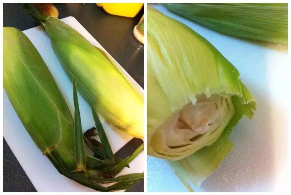 首先把玉米的根部切开,像这样,千万不要剥去玉米的外衣!