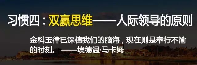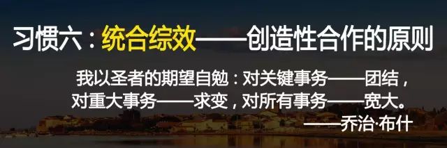 统合综效谈的是创造第三种选择——即非按照我的方式,亦非遵循你的方式,而是第三种远胜过个人之见的办法。它是互相尊重的成果-------不但是了解彼此,甚至是称许彼此的差异,欣赏对方解决问题及掌握机会手法。个人的力量是团队和家庭统合综效的利基,能使整体获得一加一大于二 的成效。实践统合综效的人际关系和团队摒弃敌对的态度,不以妥协为目标,也不仅止于合作,他们要的是创造式的合作。