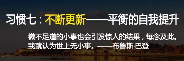 不断更新谈的是,如何在四个基本生活面向(身体、精神、智力、社会/情感)中,不断更新自己。这个习惯提升了其他六个习惯的实施效率。对组织而言,习惯七提供了愿景、更新及不断的改善,使组织不致呈现老化疲态,并迈向新的成长之径。对家庭而言,习惯七透过固定的个人及家庭活动,使家庭效能升级,就像建立传统,使家庭日新月异,即是一例。