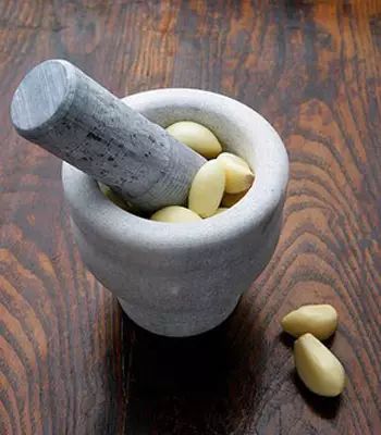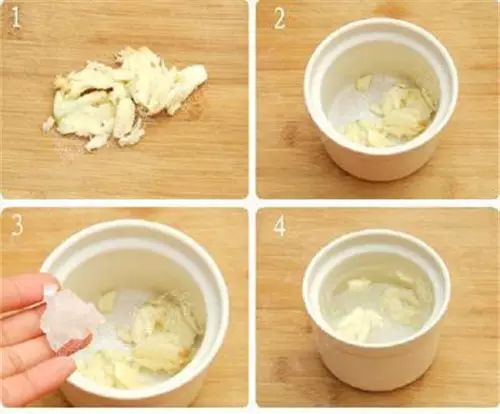 取三四头大蒜,去皮后,将蒜瓣切成一个个薄片。晚上睡前将切片的蒜瓣用火烤,等蒜片烤干、烤黄后,用擀面杖碾碎成末,越碎越好。