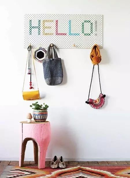 在门口玄关位置安一个洞洞板,方便挂包包帽子等物件,锈上五彩的“hello”字样,立马让家里变得俏皮有趣~