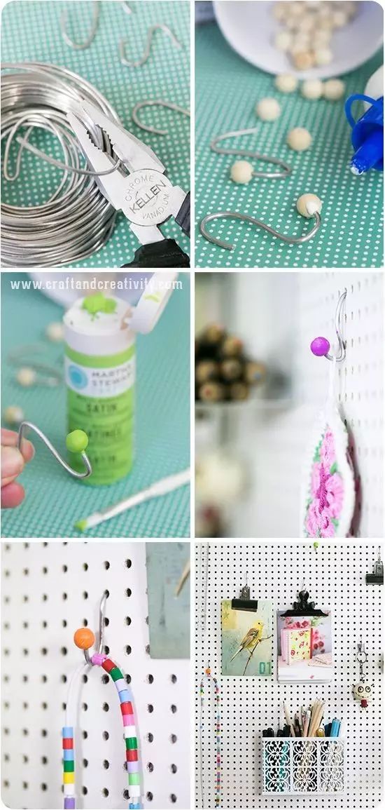 用铁丝拧一个S形挂钩扣在洞洞板上就可以悬挂各种物件~