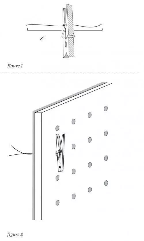 如果想用来夹照片、夹便条,就将铁丝缠绕在夹子上,穿入洞口,在洞洞板背面缠紧~
