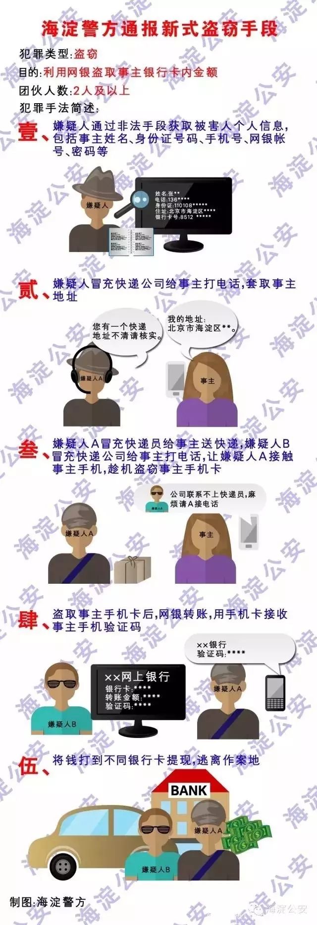 办案民警了解到,事发时一名快递员让她下楼取包裹时,称手机没电了借用唐女士的手机。唐女士拿着包裹回到单位后,发现手机SIM卡没了。紧接着,唐女士手机上的银行APP不断有消息提示,短短的几分钟内,她卡里的12万元被转走。 事件:快递员借用手机 事后卡里12万元被转走 唐女士回忆,事发前几天,曾有自称快递公司的男子打电话给她,说她有个快递包裹地址不详,让她重新说一下。 唐女士说,“当快递员让我说一下详细地址时,我当时根本没起疑心,因为我老在网上买东西,所以就没当回事,就向对方提供了自己的地址。” 在不久后某天的中午,唐女士在办公室接到快递员电话,“快递员带着帽子,我当时也没看清他长什么样。他递过来一个单子,让我填满意度评价,我想都没想就接过来准备填,”唐女士说,“我填单子的时候手机响了,对方说是快递公司的,有急事找快递员,但他的手机始终打不通,如果他正给我派件,希望叫他听下电话。” “当时我也没多想就把手机递给了快递员,也就一两分钟的事,我也填完了单子,快递员把手机递给我,我拿着包裹就上楼了。”唐女士说,回单位发现手机关机了,打开手机后发现SIM卡不见了。 而拆开包裹,里面有一包糖,唐女士正在纳闷是不是送错了,这时,她收到多笔银行出账记录信息,总共被刷了12万元。 抓捕:3名嫌疑人在天津被抓获 海淀警方刑侦支队的民警调取案发周边的监控录像,很快锁定了3名嫌疑人,但他们头戴鸭舌帽、穿着深色棉衣,很难辨认。 民警根据唐女士提供的嫌疑人电话,查到了办理涉案手机号登记的人,是女子王某。民警了解到,此人曾在江苏、天津等地出现。通过向当地警方求证,民警发现案发当天,王某在江苏,不可能来北京作案。 民警将视线锁定在天津机场附近的一家酒店内,经了解,用王某身份证登记入住的是一名男子,在调取酒店附近的监控录像与案发地监控录像比对后,侦查员发现,入住该酒店的3人与案发地的嫌疑人身形极其相似。 3月5日凌晨,民警在天津涉事酒店将林某、郭某、施某3名嫌疑人抓获,现场起获盗取的10万多元现金,仍有2万元现金在嫌疑人银行卡内,警方将其冻结。 揭秘:3人分工 1人偷卡1人打电话1人取现 据3人交代,他们偶然间从同乡处得知网上有售卖公民个人信息,事主的姓名、手机、身份证号、网银号码和密码,包括事主银行卡里有多少钱都详细记录。 据嫌疑人供述,因为知道了事主的网银账号和密码还不能取钱,多数情况下都需要优盾或者短信验证码才能转账。为了获取事主的验证码,3人在琢磨了几天后,终于想到了“解决办法”: 他们先从网上买到事主信息,登陆事主网银发现里面有钱后,就由郭某冒充快递人员给事主打电话,套出事主的住址; 趁事主接快递时,由林某给事主打电话,称快递员手机无法接通,麻烦用下事主电话; 而郭某在接电话时,趁事主不注意,将手机上的SIM卡盗取出来; 施某拿到SIM卡后,将事主网银的钱转出取现。 从2016年1月至今,3人在网上先后利用购买来的事主信息在福建、山东、上海、北京诈骗多起,目前警方已核实3起,包括唐女士在内的3人共被盗取18万元。 目前,犯罪嫌疑人施某、林某、郭某3人因涉嫌盗窃罪已被海淀警方刑事拘留。 提示:陌生号码短信链接是木马病毒 不要点 民警表示,此类案件中,嫌疑人获得的事主信息比较详细,包括事主的姓名、身份证号、电话号码,网银用户名和密码,警方推测嫌疑人应该是通过短信发送链接木马盗取事主手机内的信息,收到此类链接,如果点击,手机内的信息就会被盗取。 作案流程图↓↓↓ 除了不能随意借手机外,收快递还必须注意这些↓↓↓