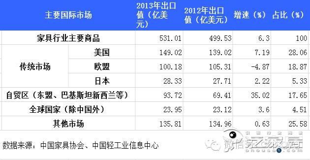 (3)出口格局呈现新变化。受全球经济复苏乏力影响,2013年我国家具行业出口格局有所变化,新兴市场成为亮点。2013年,我国对美国、欧盟、日本三大传统市场累计出口277.52亿美元,同比增长2.02%,占出口总额的52.26%,份额比上年减少2.2%。对新兴市场出口整体增速较快,其中对自贸区和金砖国家出口额117.67亿美元,同比增长27.17%,对新增出口值贡献率达到79.86%,拉动全行业出口增长5.03%。2013年家具行业主要商品出口主要国际市场情况如下表所示: