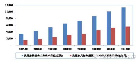 (1)产业规模在消费品行业中较大。我国家具行业规模和产值一直稳定增长,2013年,家具行业规模以上企业4716个,累计完成主营业务收入6,462.75 亿元,比2012年同比增长14.30%。目前家具制造业已成为继住房、汽车、食品之后的第四大消费品行业。2005-2012年,我国家具行业工业生产总值、规模以上企业工业生产总值及其增长情况如下图所示:
