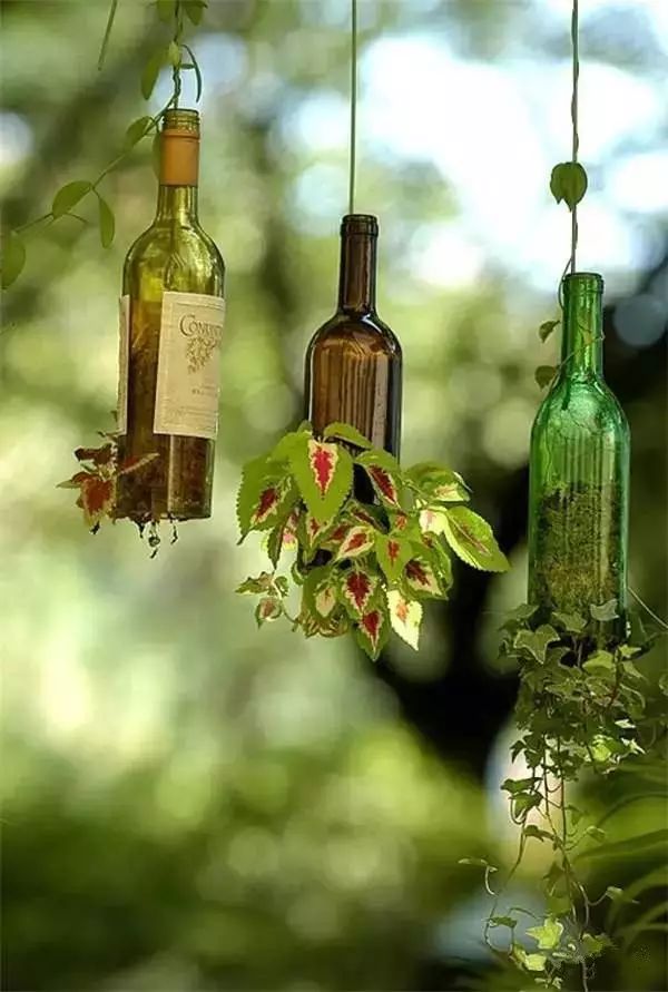 13.红酒瓶,其他瓶子也可以,装进泥土,在底部琢上洞口,做成一款唯美的花草吊饰