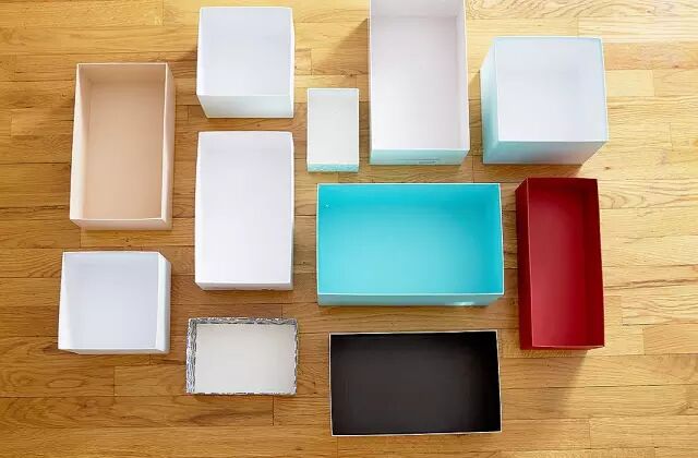1.第一招是找来大大小小的鞋盒,礼品盒作为储物盒,把需要用的单品分门别类放置。▼