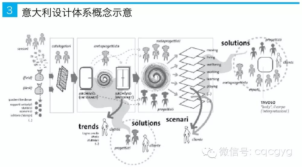 德国的短板恰恰是意大利家具产业体系的优势所在,那就是整个产业生态都是按照设计驱动来建立的,依靠的是以中小型企业为主体的产业集群。意大利设计从潮流的研究、场景的构筑,到概念设计,以及最终的解决方案,能够始终给消费者带来不一样的惊喜感觉,并引领着全球设计的走向,见图3所示。