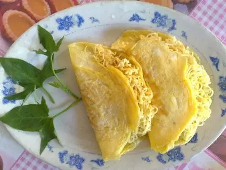 做法:鸡蛋打进大碗里,加半茶匙盐,用筷子搅拌均匀,搅拌成蛋液。锅里放少许油,倒入一半蛋液,摊成蛋饼状,小火煎制,蛋饼两面金黄熟透装盘待用。锅里放适量清水,大火烧开,再把面饼放进锅中煮至面饼自然化开变软即可捞起。再倒适量方便面的调味包,用筷子拌匀。再用筷子夹起适量面条放到蛋饼一半的位置上。7)再把另一边的蛋饼盖合在面上即可,有番茄酱的可再加少许番茄酱食用。