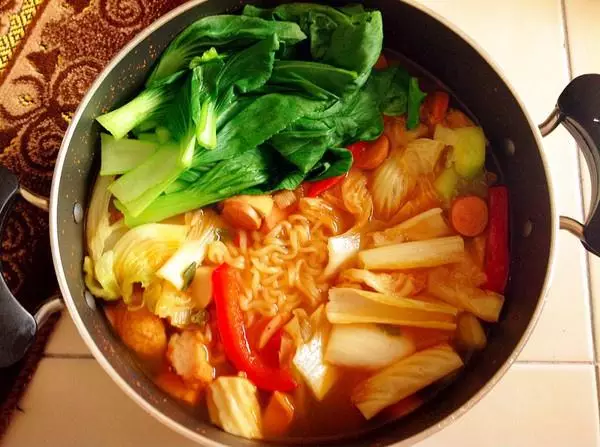 做法:将火腿切片,泡菜切好。锅内放热油,下辣白菜炒熟。锅内倒清汤,加韩国辣酱,大豆酱,辣椒粉,酱油,料酒,鱼露,精盐,胡椒粉小火慢慢熬,然后下如金针菇。另起一个锅,煮开水后,把火腿,青菜,拉面烫熟。煮好的面放在锅内,加入汤,吃的时候加洋葱,香菜青葱即刻。
