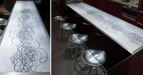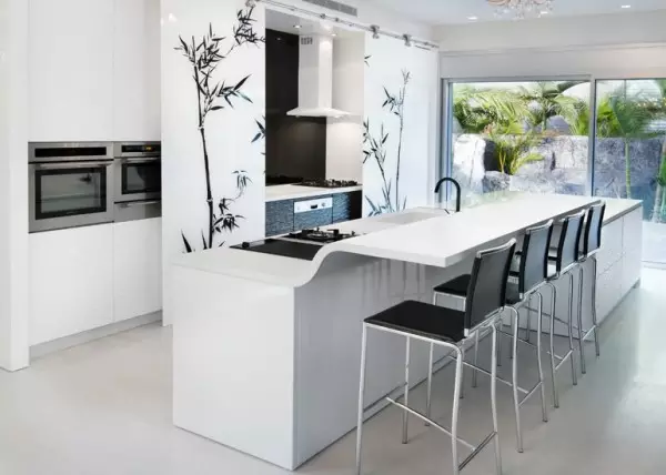 Zaha Hadid设计的智能厨房系统由如下设备组成:两个自由岛组合,分别为烹饪区和洗刷区,5米多长的操作台面令人印象深刻,整合了很多其他的东西,比如特殊的加热薄膜、触摸控制面板、声控系统、空气清新剂、LED照明系统和多媒体娱乐系统等,都可根据客户需求自由搭配,而且还可以自由定制多达120种颜色。