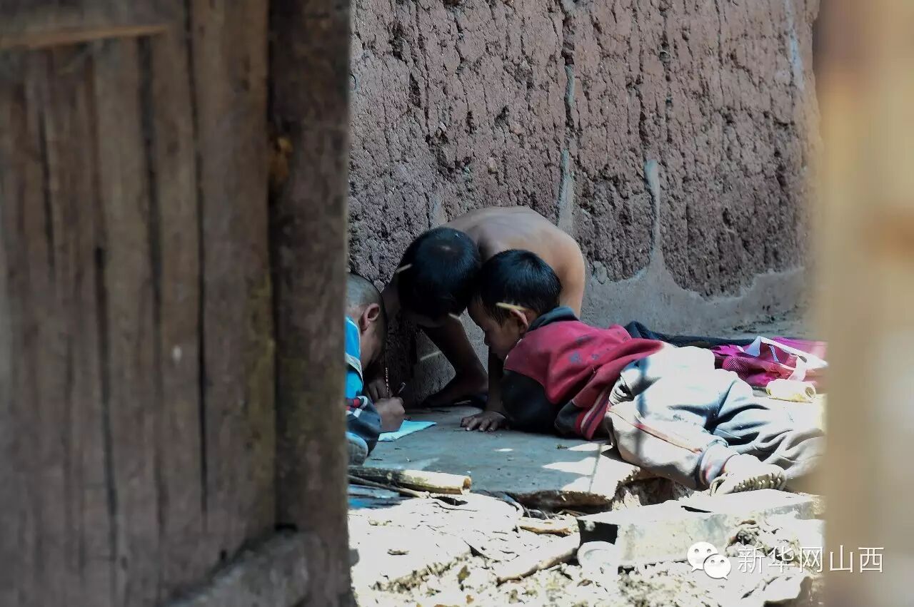 6月24日,美姑县30多个麻风村之一的瓦基机村一户农家院落里,三个失学儿童趴在地上看书写字。