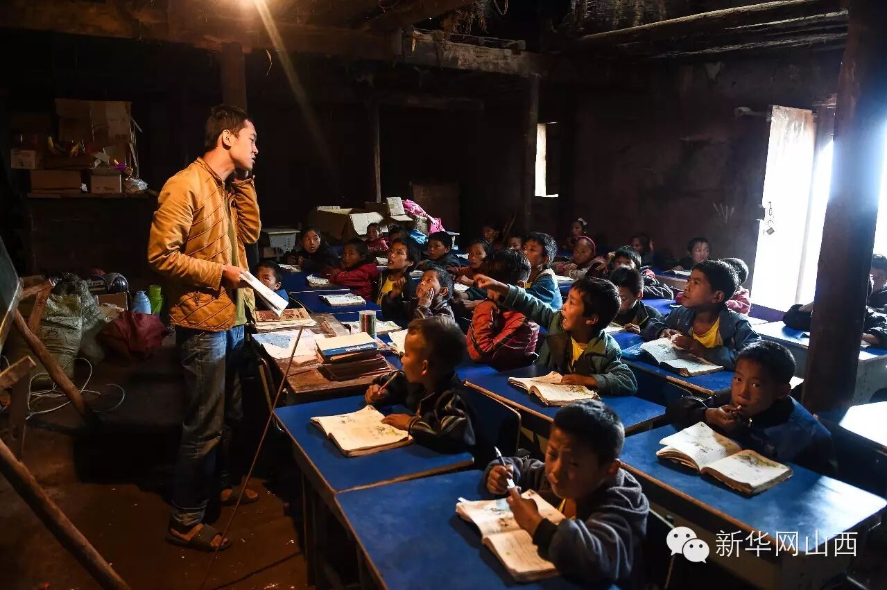 6月20日,尔其乡甲拉小学,支教老师孙杰正在昏暗的教室里上课。