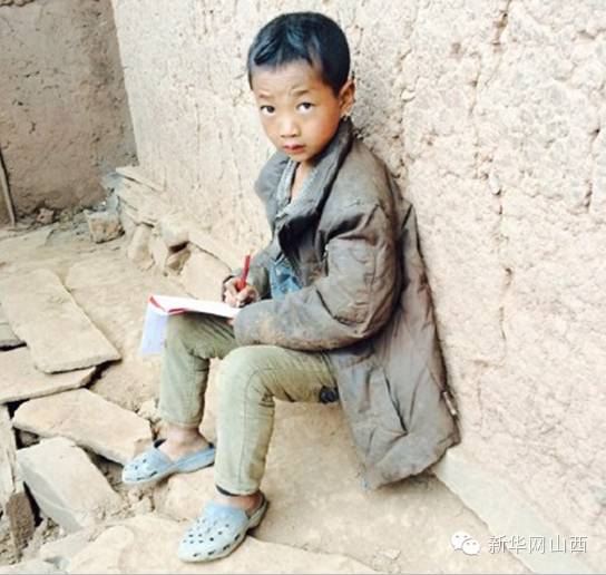 图为尔其乡甲拉小学支教老师许胜坚拍摄的坐在地上写作业的洛格石达。