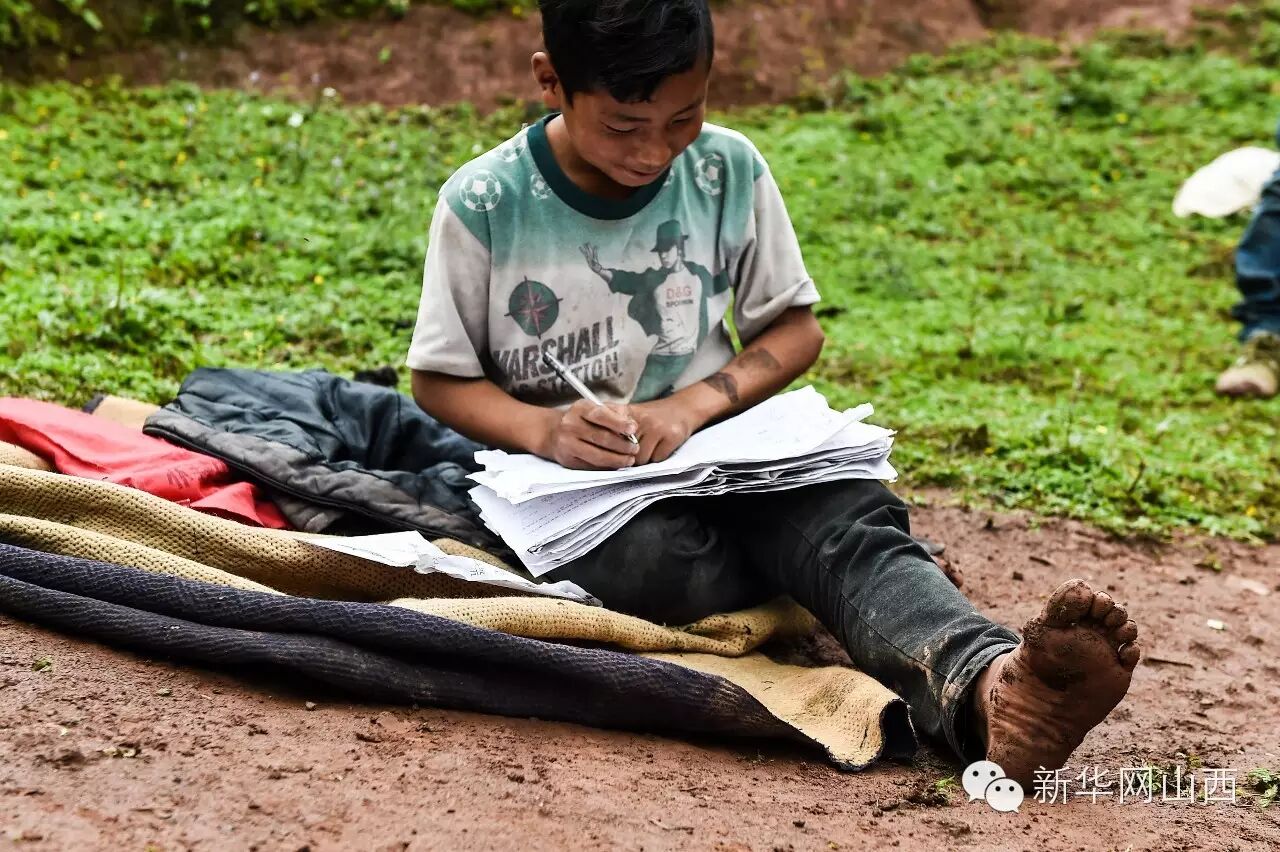 6月21日,从甲拉村前往尼勒觉村的路上,一个孩子坐在地上写作业。