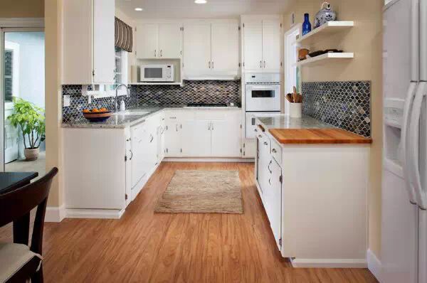 厨房地面的颜色及图案也十分重要,素色的地板会清楚显现污渍,能够节省清洁时间。另外,浅色的地板会令房子更明亮,深色地板则会使房子较暗,过分鲜艳夺目的图案会使画面凌乱,所以在小厨房里铺简单的地面永远是正确的选择。如果地面承重没有问题,则可有多种地砖选择,例如花岗岩、陶瓷砖、赤陶、木料、乙烯基、软木或亚麻油毡。